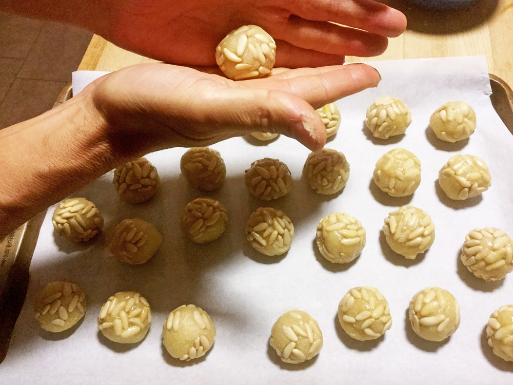 - Décorer les boules avec des amandes, des pignons ou de la noix de coco, et peindre aux jaune d’œuf. Les placer sur une plaque à four sur du papier à four (sinon, ça colle à la plaque).