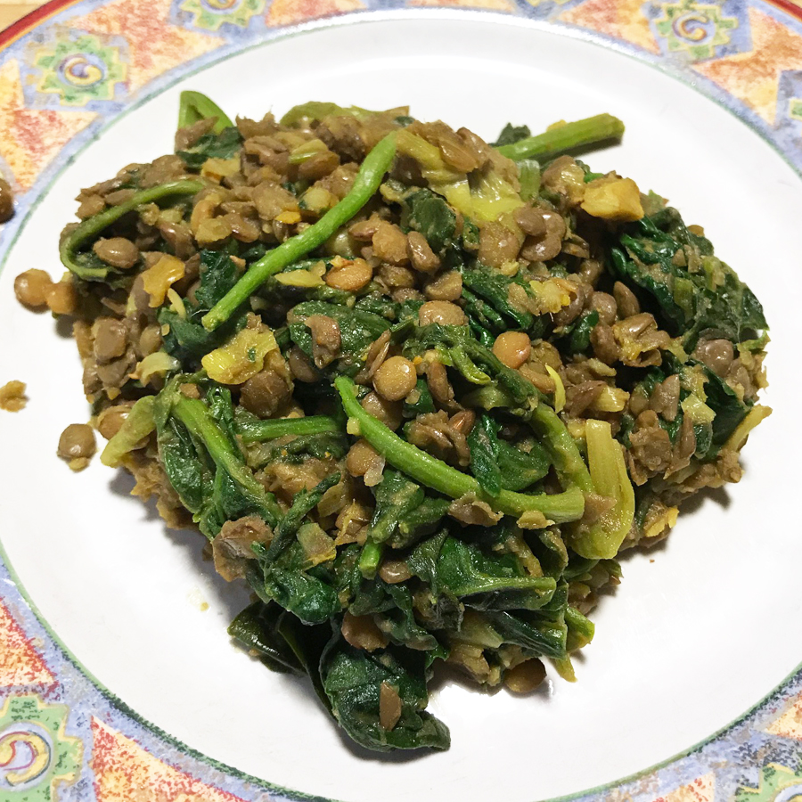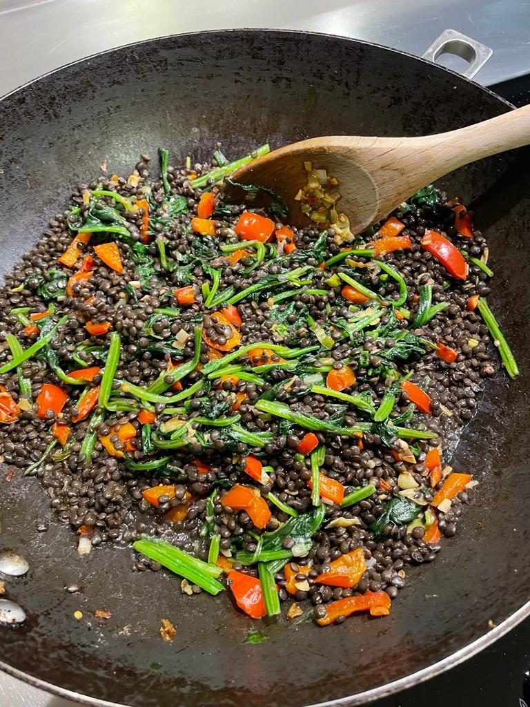 - Quand les épinards sont presques cuits, ajouter les lentilles cuites essorées, bien mélanger et laisser cuire 1 ou 2 mn.