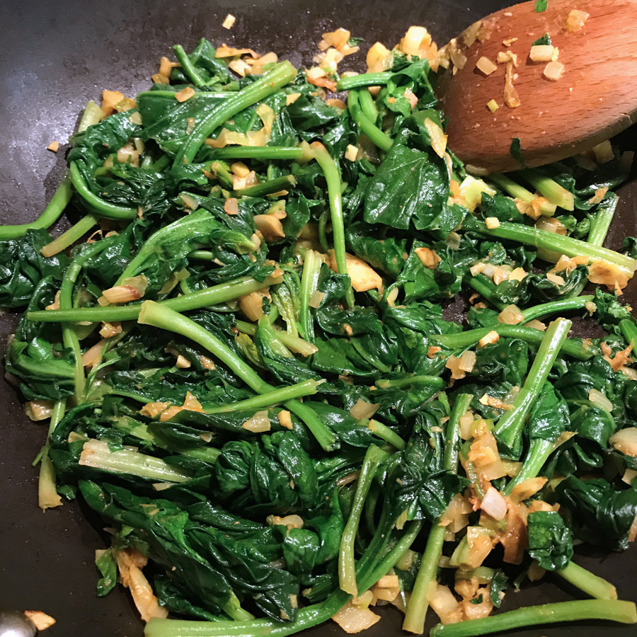 - Ajouter les épinards, saler (attention, saler en proportion à la quantité finale, pas au grand volume d’épinards frais) et faire sauter en remuant souvent.
