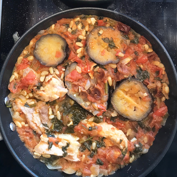- Ajouter les rondelles d’aubergine et/ou le poulet, couvrir et cuire à feu doux 30 à 40 mn (jusque ce le poulet soit bien cuit.