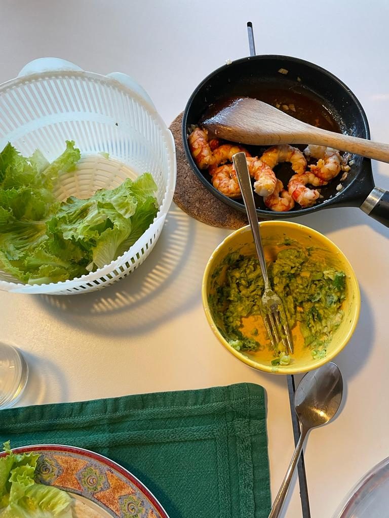 Poser le tout sur la table, chacun prépare son taco. On tartine une bonne cuillérée de guacamole, on ajoute les crevettes ou le poisson, la laitue, puis on plie en deux et on mord à pleine dents. Miam !